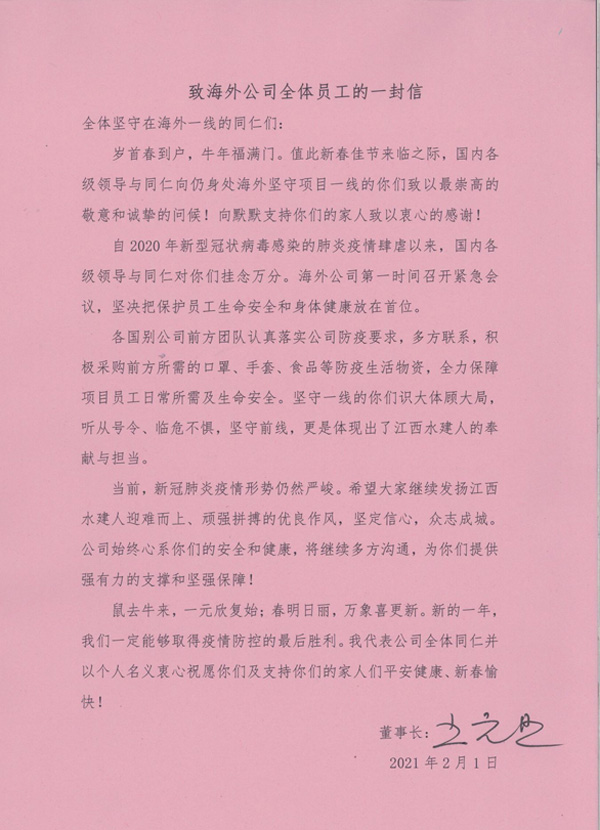 當(dāng)前,新冠肺炎疫情形勢仍然嚴(yán)峻。希望大家繼續(xù)發(fā)揚(yáng)江西水建人迎難而上、頑強(qiáng)拼搏的優(yōu)良作風(fēng),堅(jiān)定信心,眾志成城。公司始終心系你們的安全和健康,將繼續(xù)多方溝通,為你們提供強(qiáng)有力的支撐和堅(jiān)強(qiáng)保障!
