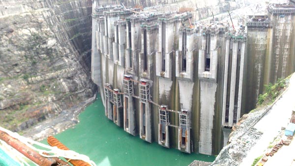 溪洛渡水電站位于四川省雷波縣和云南省永善縣接壤的金沙江峽谷段,是金沙江水電基地下游四個(gè)巨型水電站中最大的一個(gè),以發(fā)電為主,兼有攔沙、防洪和改善下游航運(yùn)等綜合效益的大型水電站。溪洛渡水電站樞紐由攔河壩、泄洪、引水、發(fā)電等建筑物組成。攔河壩為混凝土雙曲拱壩,壩頂高程610米,最大壩高278米,壩頂弧長(zhǎng)698.07米;左、右兩岸布置地下廠房,各安裝9臺(tái)水輪發(fā)電機(jī)組,單機(jī)容量77萬(wàn)千瓦,電站總裝機(jī)1386萬(wàn)千瓦,多年平均發(fā)電量571.2億千瓦時(shí)。裝機(jī)容量與原來(lái)世界第二大水電站——伊泰普水電站(1400萬(wàn)千瓦)相當(dāng),是中國(guó)第二、世界第三大水電站。