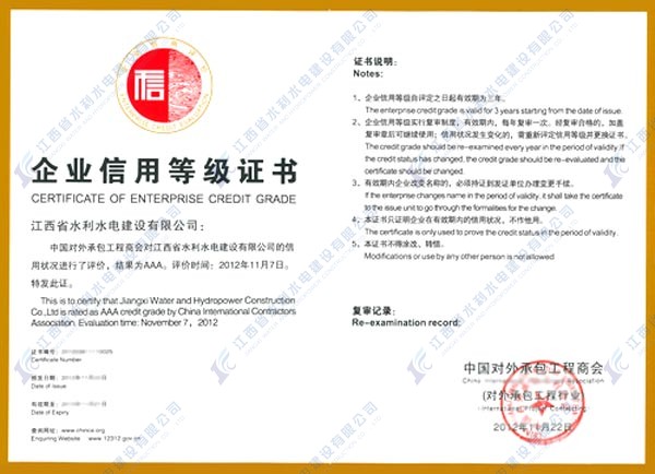 根據(jù)商務(wù)部、國(guó)資委聯(lián)合發(fā)布的《商會(huì)協(xié)會(huì)行業(yè)信用建設(shè)工作指導(dǎo)意見(jiàn)》的要求,中國(guó)對(duì)外承包工程商會(huì)于2012年9月啟動(dòng)2012年度對(duì)外承包工程與勞務(wù)合作企業(yè)信用等級(jí)評(píng)價(jià)工作。經(jīng)對(duì)外承包工程與勞務(wù)合作企業(yè)信用等級(jí)評(píng)審委員會(huì)第八次工作會(huì)議審議,江西省水利水電建設(shè)有限公司被評(píng)定為2012年度對(duì)外承包工程企業(yè)信用評(píng)價(jià)AAA級(jí)信用企業(yè)。