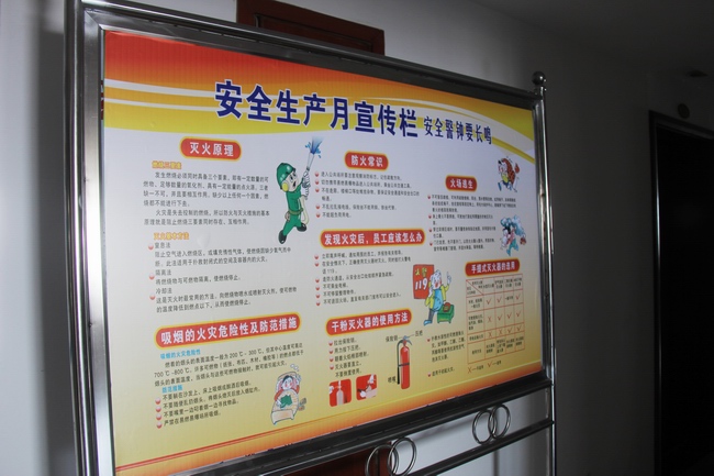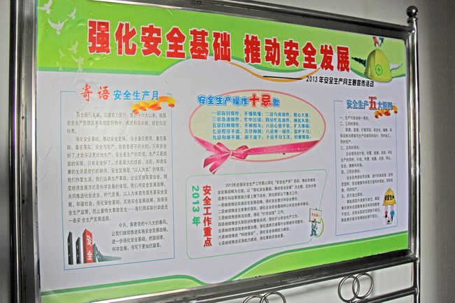 按照2013年“安全生產(chǎn)月”活動實施方案要求,公司所屬各單位張貼、懸掛安全生產(chǎn)警示語,突出宣傳“強化安全基礎,推動安全發(fā)展”的活動主題。