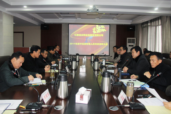 2015年1月31日,江西省水利水電建設有限公司2014年度年終述職大會在公司總部順利舉行。公司董事長、黨委書記王元旦,總經理徐洪良,國內、國外工作的中高層管理人員、項目經理代表,員工代表共50多人參加了述職大會??偨浝硇旌榱贾鞒謺h。