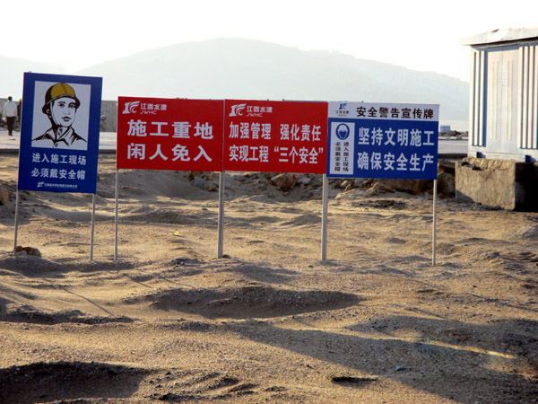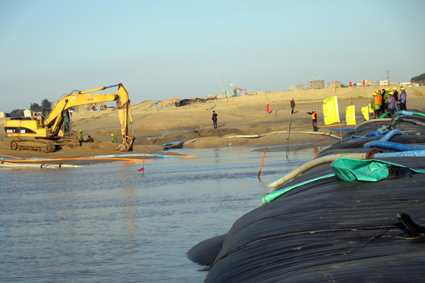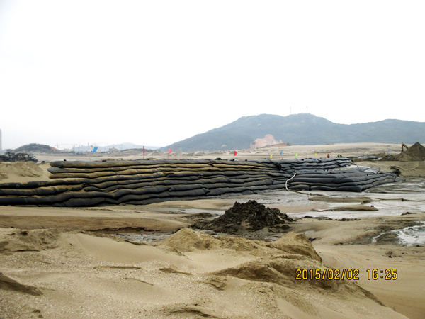 平潭綜合實(shí)驗(yàn)區(qū),主島為海壇島,位于福建省東部,與臺(tái)灣隔海相望,是中國(guó)大陸距離臺(tái)灣島最近的地方,是中國(guó)第五大島,有福建的“馬爾代夫”之稱。平潭綜合實(shí)驗(yàn)區(qū)如意湖防潮閘工程項(xiàng)目總投資1.3億元,我公司承建的土建工程包括排澇閘、防潮閘、公路橋、上下游兩岸翼墻、防沖消能、控制房等土建工程施工(含導(dǎo)流明渠開挖、圍堰填筑)。平潭(簡(jiǎn)稱嵐)年平均風(fēng)速超過五級(jí)以上,大風(fēng)呼嘯,沒來這里感受不到風(fēng)有多大!依據(jù)工程設(shè)計(jì)及進(jìn)度要求,在落差8m潮汐中的軟基上進(jìn)行圍堰模袋充砂以截流海水,在惡劣地質(zhì)條件的海中建閘,與潮水賽跑、跟臺(tái)風(fēng)搶工期,潮起潮落,給工程建設(shè)平添了許多艱難與艱辛。