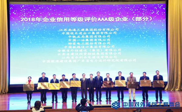 12月5日,中國對外承包工程商會第七屆理事會第四次全體會議在山東濟(jì)南隆重召開,來自全國各地的140多家理事單位的300多名代表參加會議。公司董事、海外公司執(zhí)行董事張周平出席會議。會議頒發(fā)了“2018年企業(yè)信用等級評價AAA級企業(yè)(部分)”牌匾,公司憑借良好的業(yè)績和口碑,再次榮獲中國對外承包工程企業(yè)信用評價AAA級信用企業(yè),并在現(xiàn)場受邀上臺接受授牌。