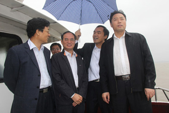 楊丕龍副廳長等冒雨登上快艇甲板察看固岸應急度汛工程