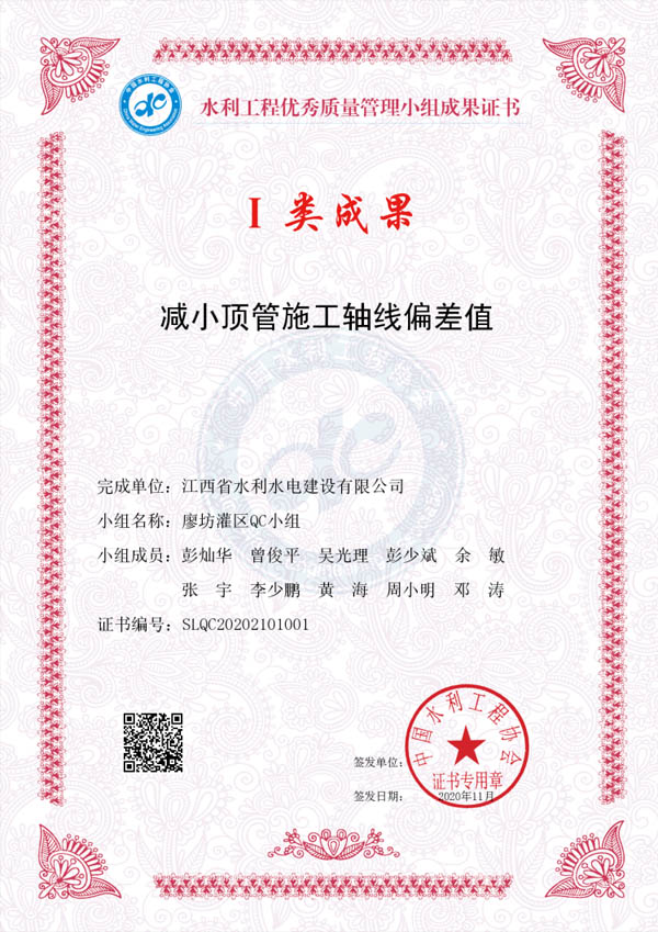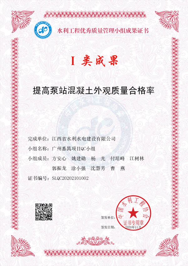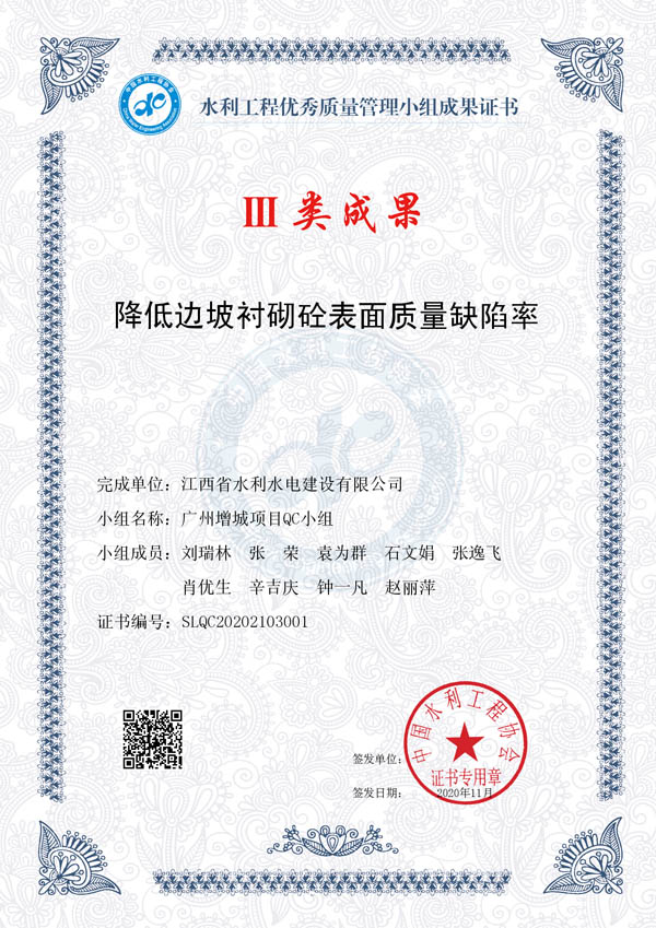 其中:廖坊灌區(qū)QC小組編寫(xiě)的《減小頂管施工軸線偏差值》獲I類(lèi)成果獎(jiǎng)、廣州番禺項(xiàng)目QC小組編寫(xiě)的《提高泵站混凝土外觀質(zhì)量合格率》獲I類(lèi)成果獎(jiǎng)、廣州增城項(xiàng)目QC小組編寫(xiě)的《降低邊坡襯砌砼表面質(zhì)量缺陷率》獲III類(lèi)成果獎(jiǎng)。