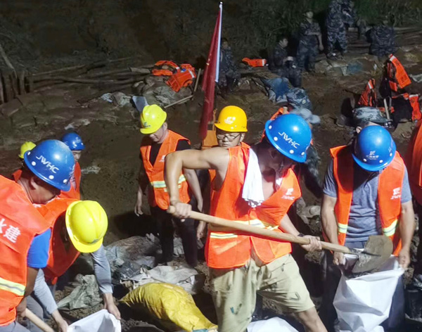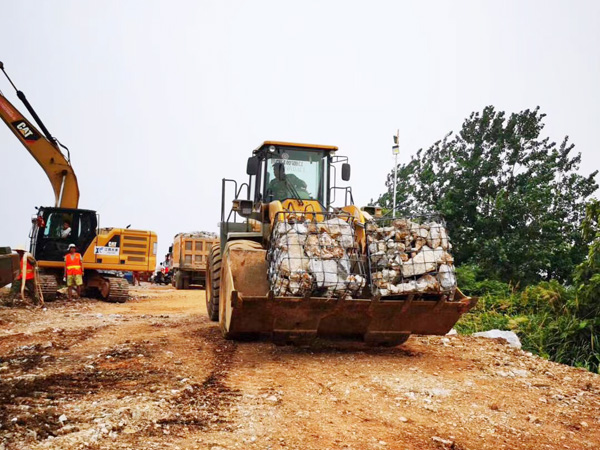 7月14日14時,封堵作業(yè)正式啟動,南北兩岸同時進占施工。然而,困難層出不窮:道路不平,存在積水,影響車輛通行;一線搶險人員的生活保障還不夠完善,吃住條件艱苦,防雨防曬防蚊設(shè)施簡陋,無便攜照明設(shè)施;砂石骨料耗量巨大,但存在配額限制,獲取來源較少。但現(xiàn)場人員攻堅克難,積極與政府、當?shù)丶捌h廠商溝通,解決了人員基本需求和石料問題,并在當日順利鋪石20米,邁上堅實的第一步。